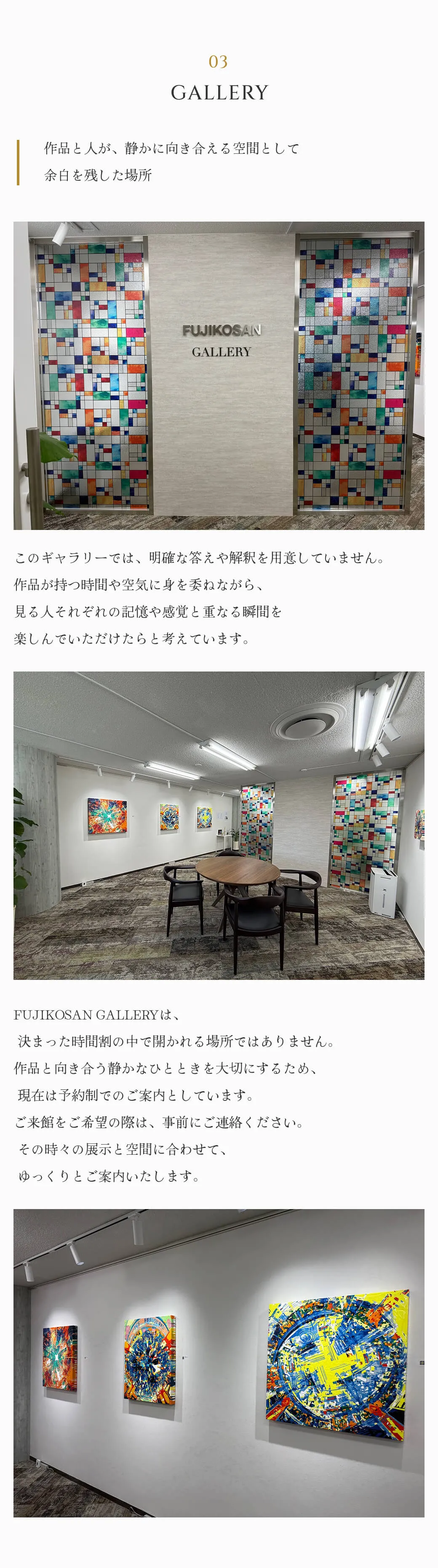 FUJIKOSAN GALLERYは、決まった時間制の中で開かれる場所ではありません。作品と向き合う静かなひとときを大切にするため、現在は予約制でのご案内としています。ご来館をご希望の際は、事前にご連絡ください。その時々の展示と空間に合わせて、ゆっくりとご案内いたします。